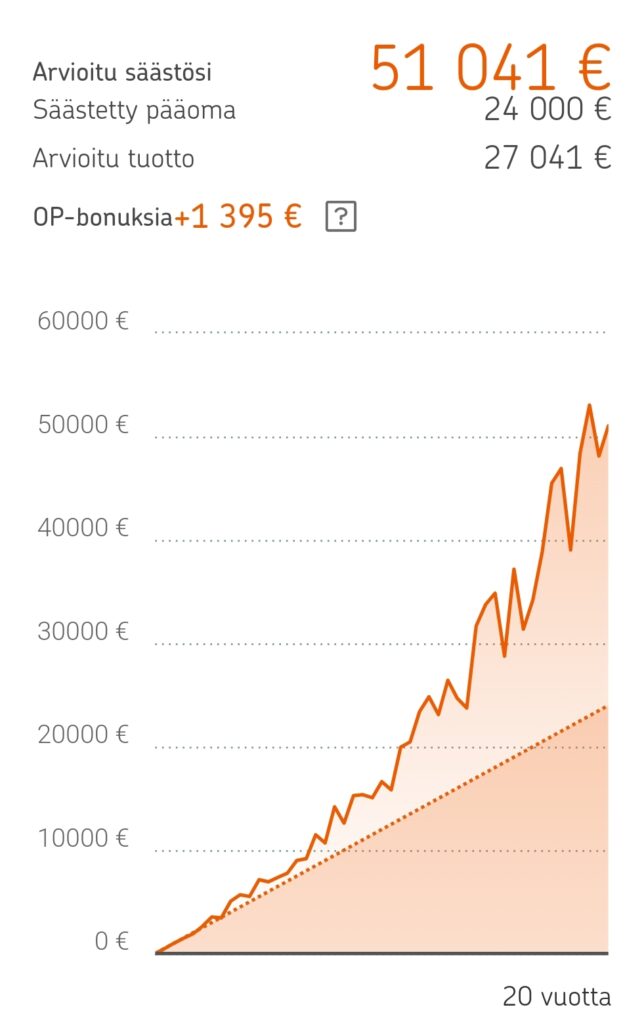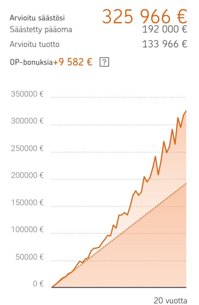 Sivun kuvissa olen käyttänyt Osuuspankin Korkoa korolle -laskuria. Laskuri löytyy osoitteesta https://www.op.fi/henkiloasiakkaat/saastot-ja-sijoitukset/tyokalut/saastolaskuri.